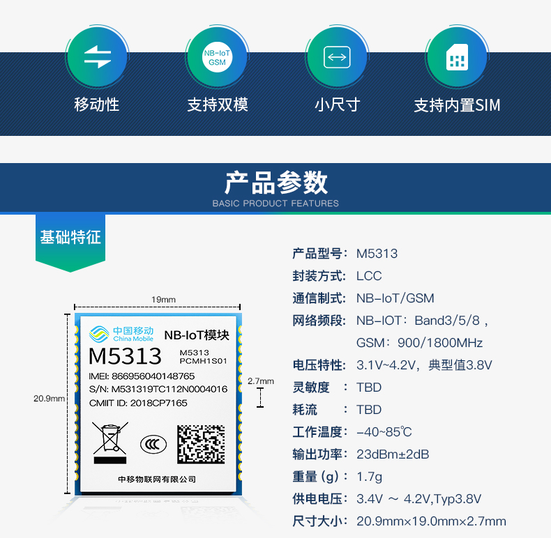 中國移動OneMO NB-IOT/GSM物聯網全網通模塊M5313